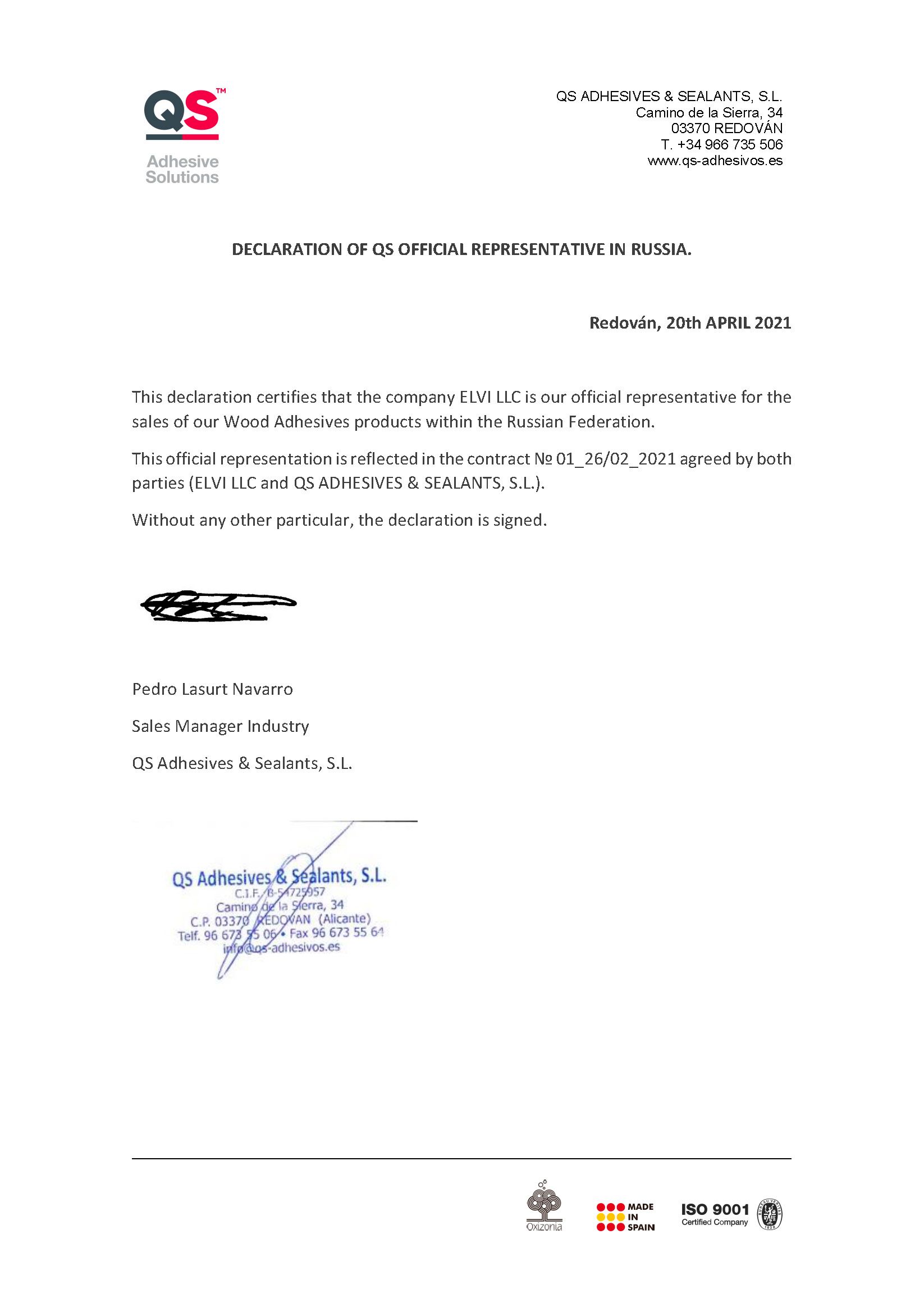 Компания ООО "Элви" является официальным дистрибьютором компании QS Adhesives & Sealants SL на территории России